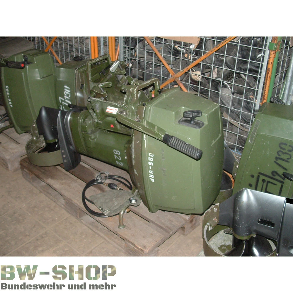 sehr strapazierfähige Bootsmotoren der Bundeswehr mit Zubehör (Benzinschlauch und Handpumpe).