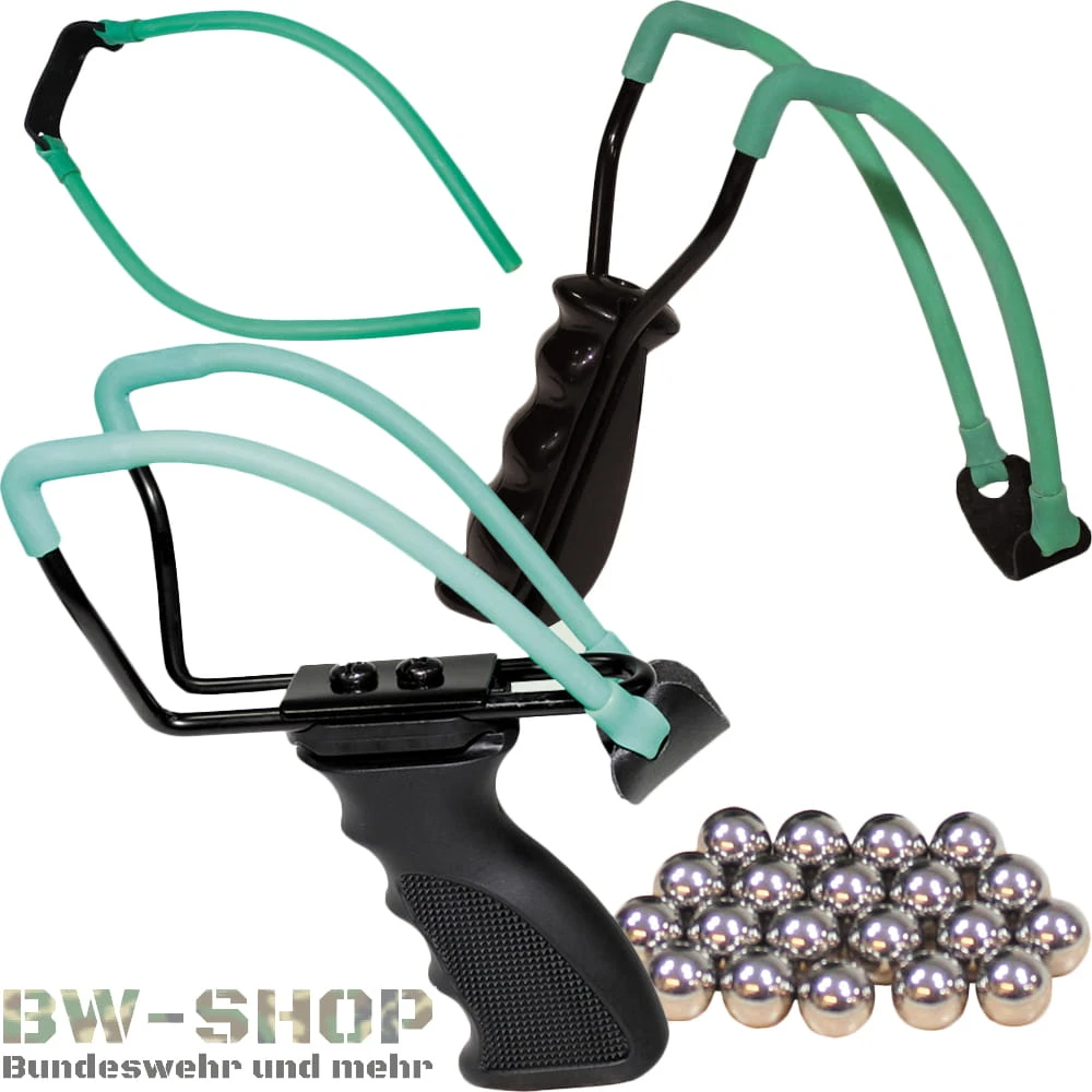 wählbar zwischen der Steinschleuder (Deluxe), Steinschleuder (Fun), Ersatzgummi für die Steinschleuder und Stahlkugeln mit 8mm oder 10mm Durchmesser