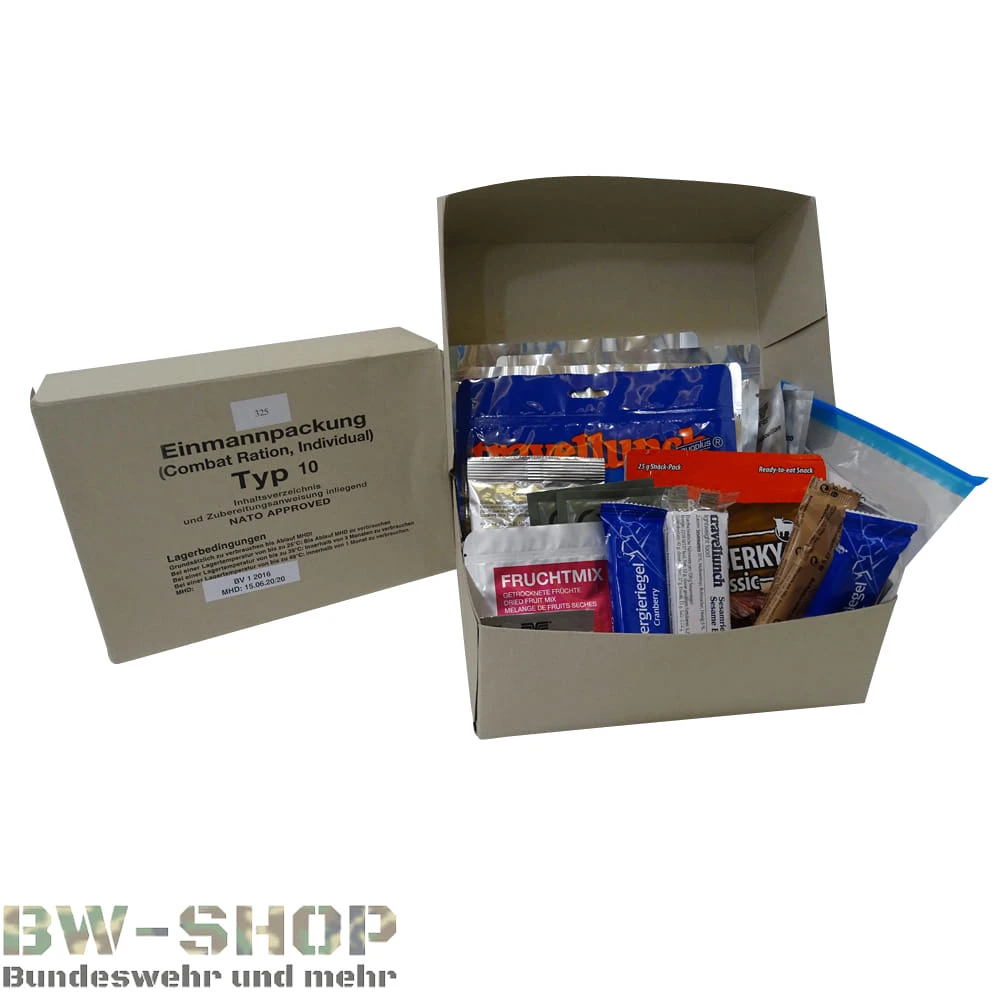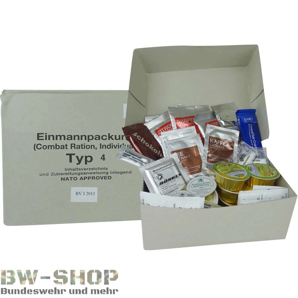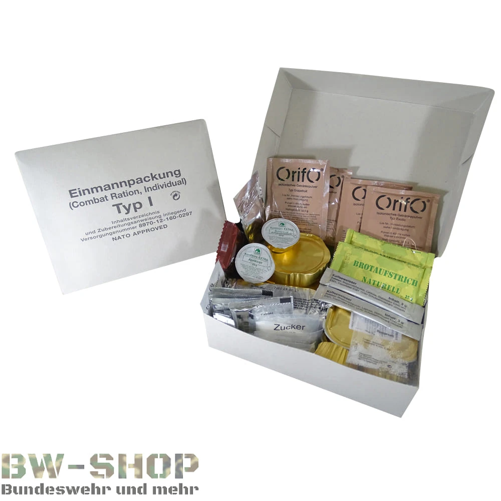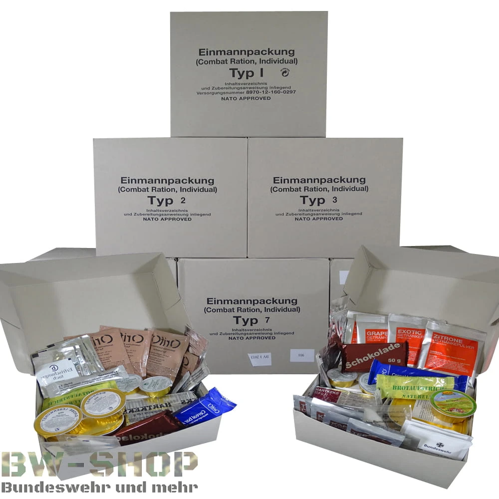Essensrationen (Einmannpackungen) zur Verpflegung der Bundeswehr zum Überleben im Freien. Optimale Notverpflegung oder Notration, als All-in-One Paket, was zum Überleben nötig ist. Nähere Informationen über die einzelnen Bestandteile einer Ration finden Sie in der Artikelbeschreibung.